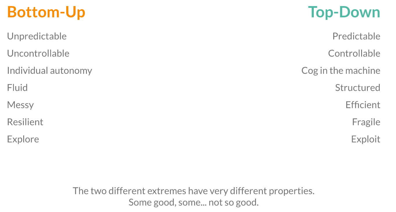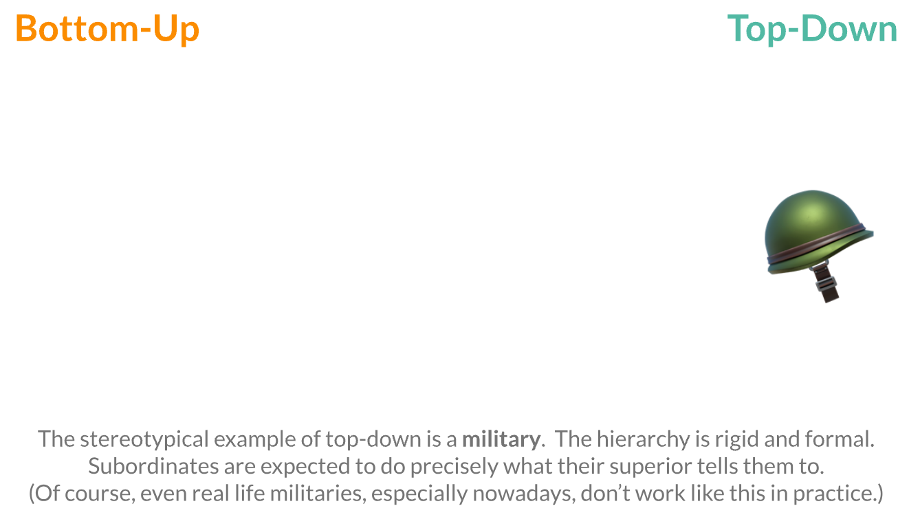 I first read Alex Komoroske’s Slime Mold deck while working at Verily back when we were still part of Google. At first I bristled at the dated stereotypes of the military as a top-down organization but it look like Alex has updated the deck with a caveat (slide 14):