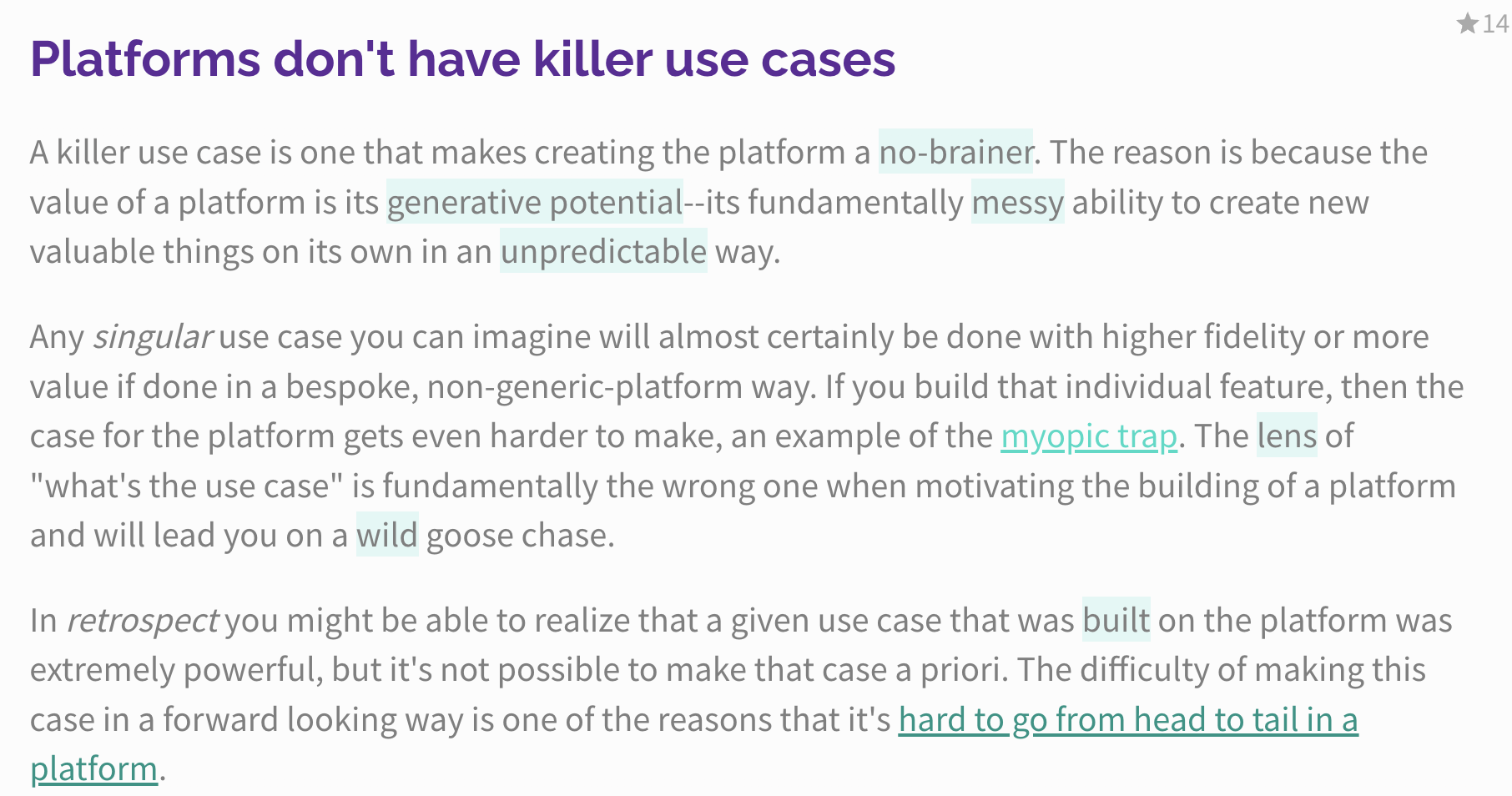 The term platform is thrown around in product marketing material to the point that its requires further definition. I like Bill Gates’s take: “A platform is when the economic value of everybody that uses it, exceeds the value of the company that creates it”. Ben Thompson offers a great post with more on this definition in The Bill Gates Line: