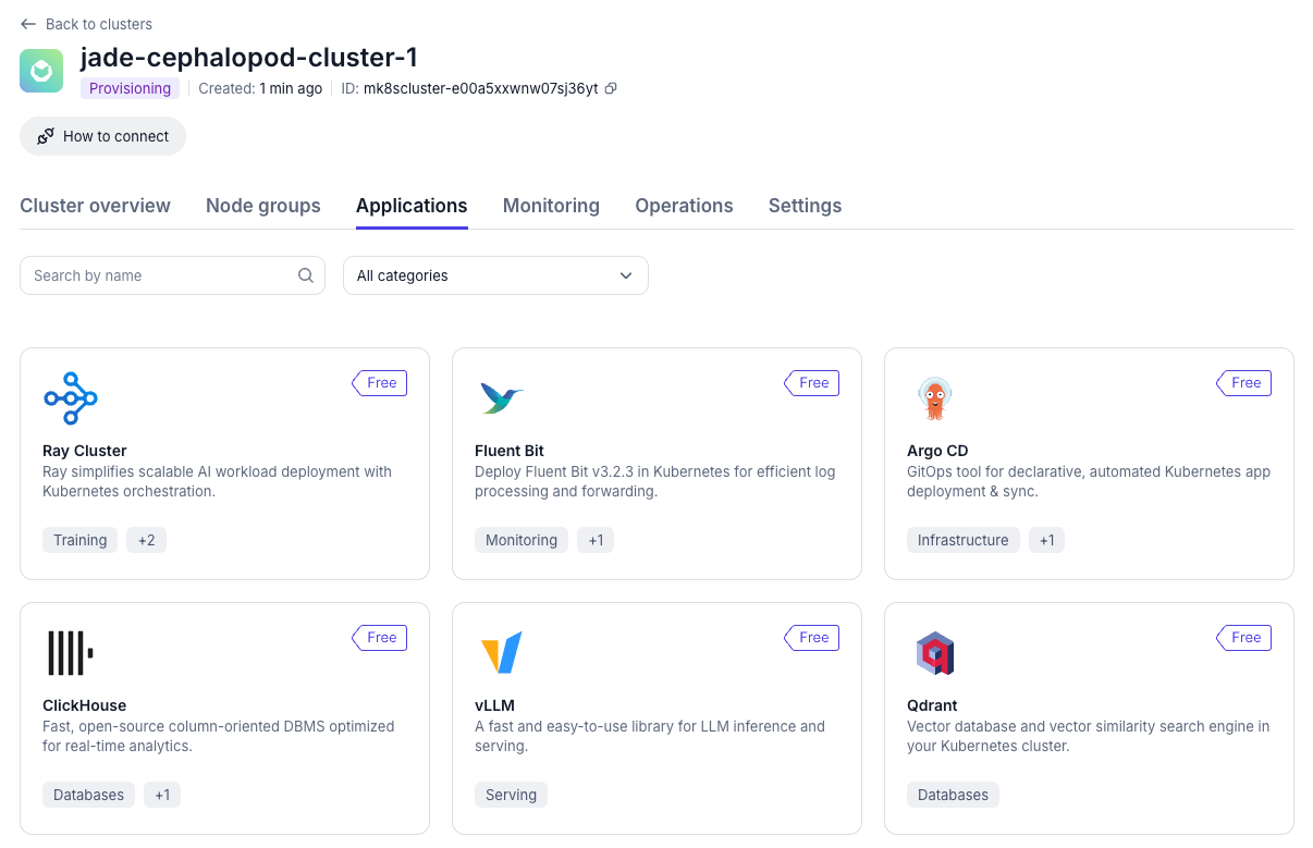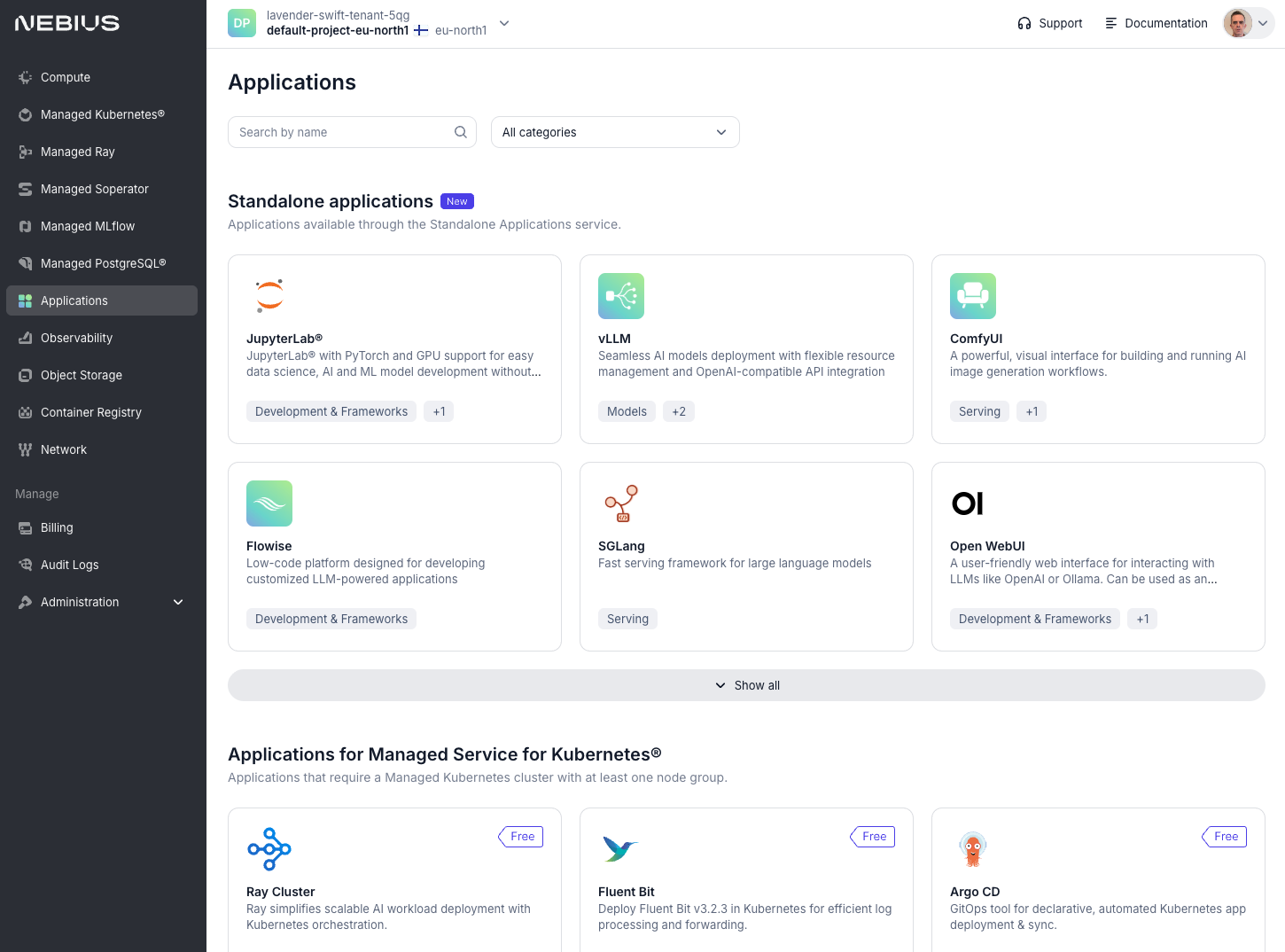 Nebius breaks out applications into 2 broad sections: Standalone Apps and Apps for Managed Service for Kubernetes