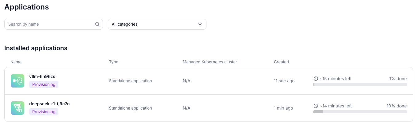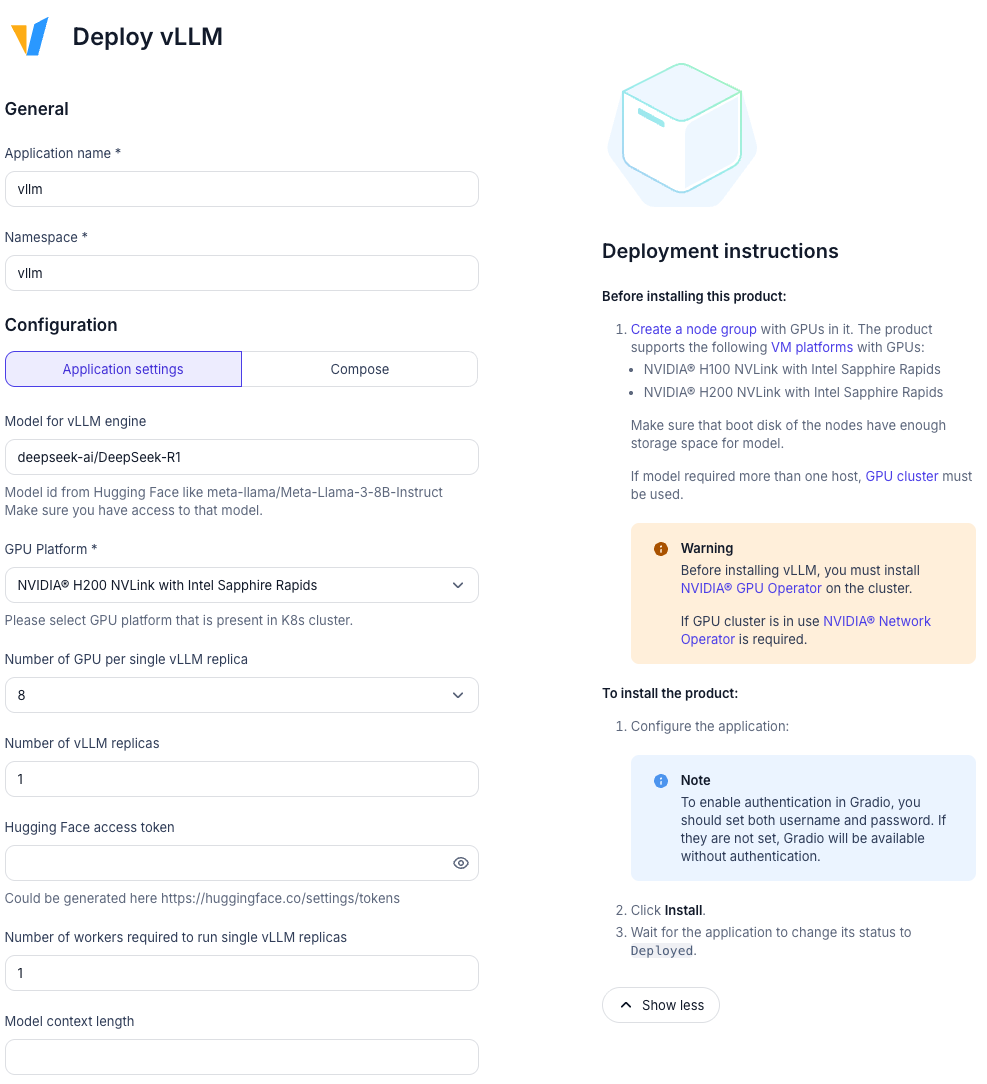 - The application framing is a little loose, e.g. you can deploy applications that cover vLLM (which then asks for a model), or models like DeepSeek-R1 (which bundles vLLM). I assume that most users don’t have dozens of apps so this probably works just fine.