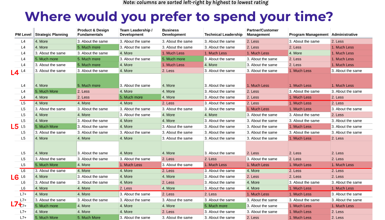 - 7 PMs (25%, mix of L4 & L5) responded that they spend no time on Business Development. PMs of all levels should be involved in developing their businesses so we should dig into this. 50% of L4s report zero time on BD.